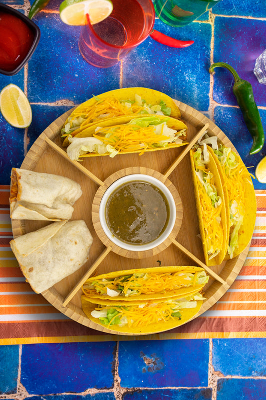 Bamboo Taco Platter with Ceramic Dip Cup – Perfect for Tacos, Nachos, and Mexican Dishes