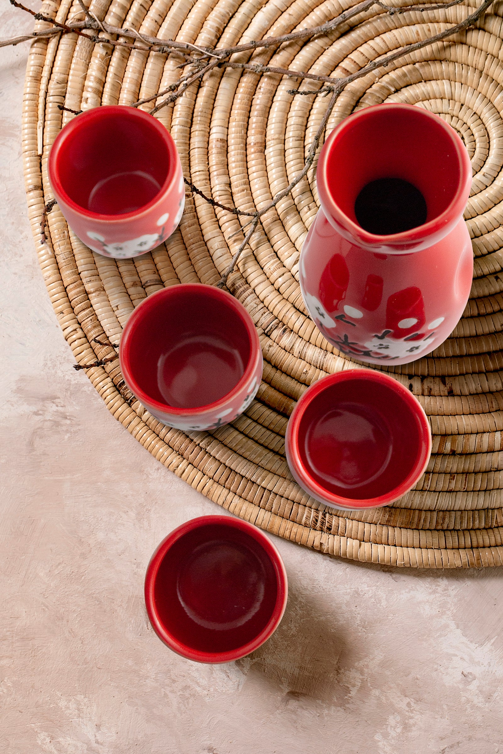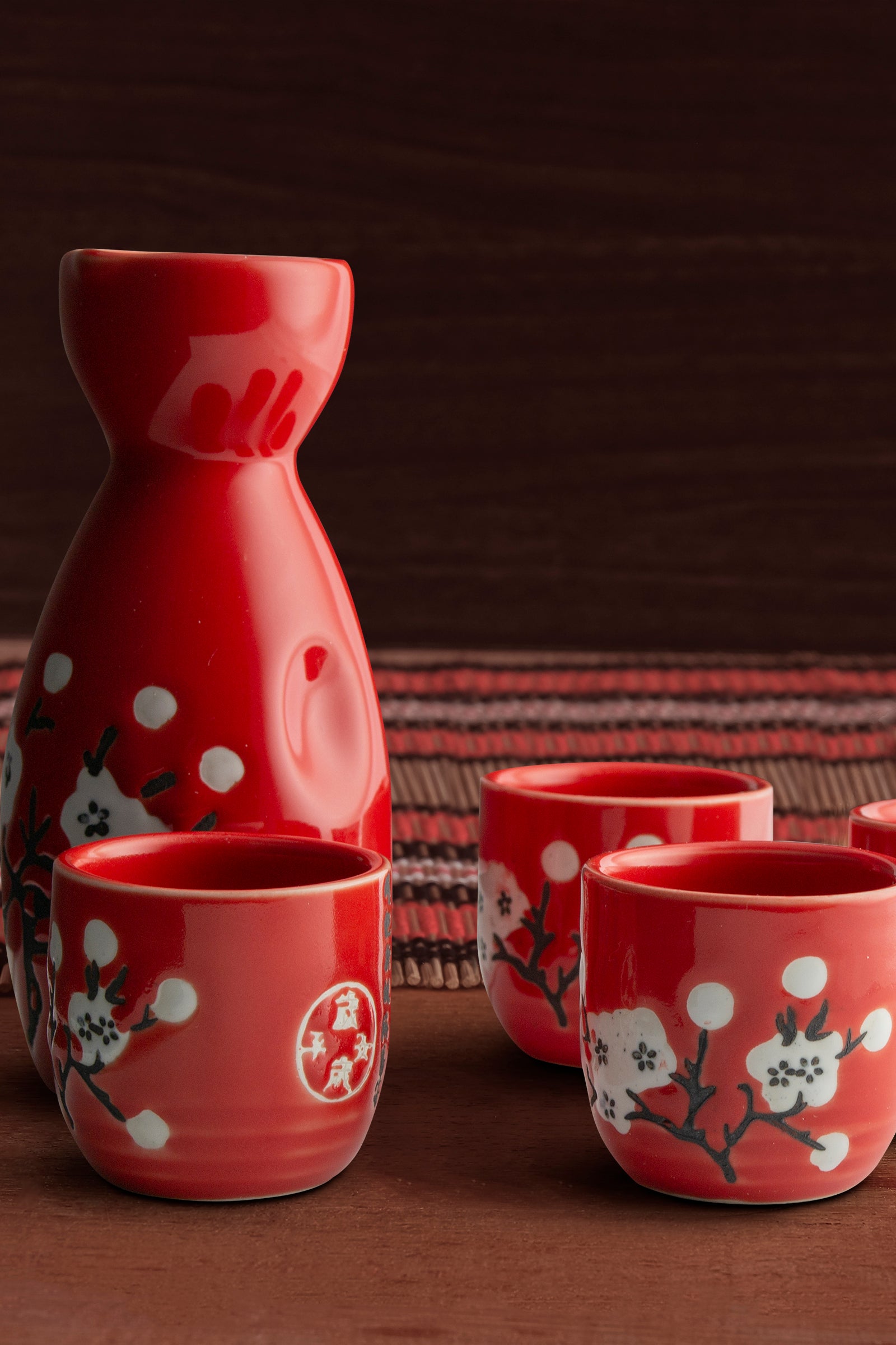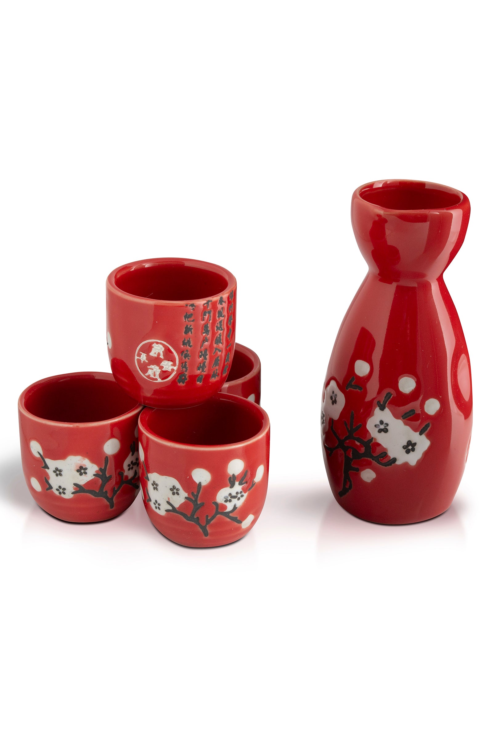 Top off your favorite dinner with this five-piece sake set. This five-piece set consists of four sake cups that fit in the palm of your hand and a wine carafe that features a spout on one end for easy pouring.