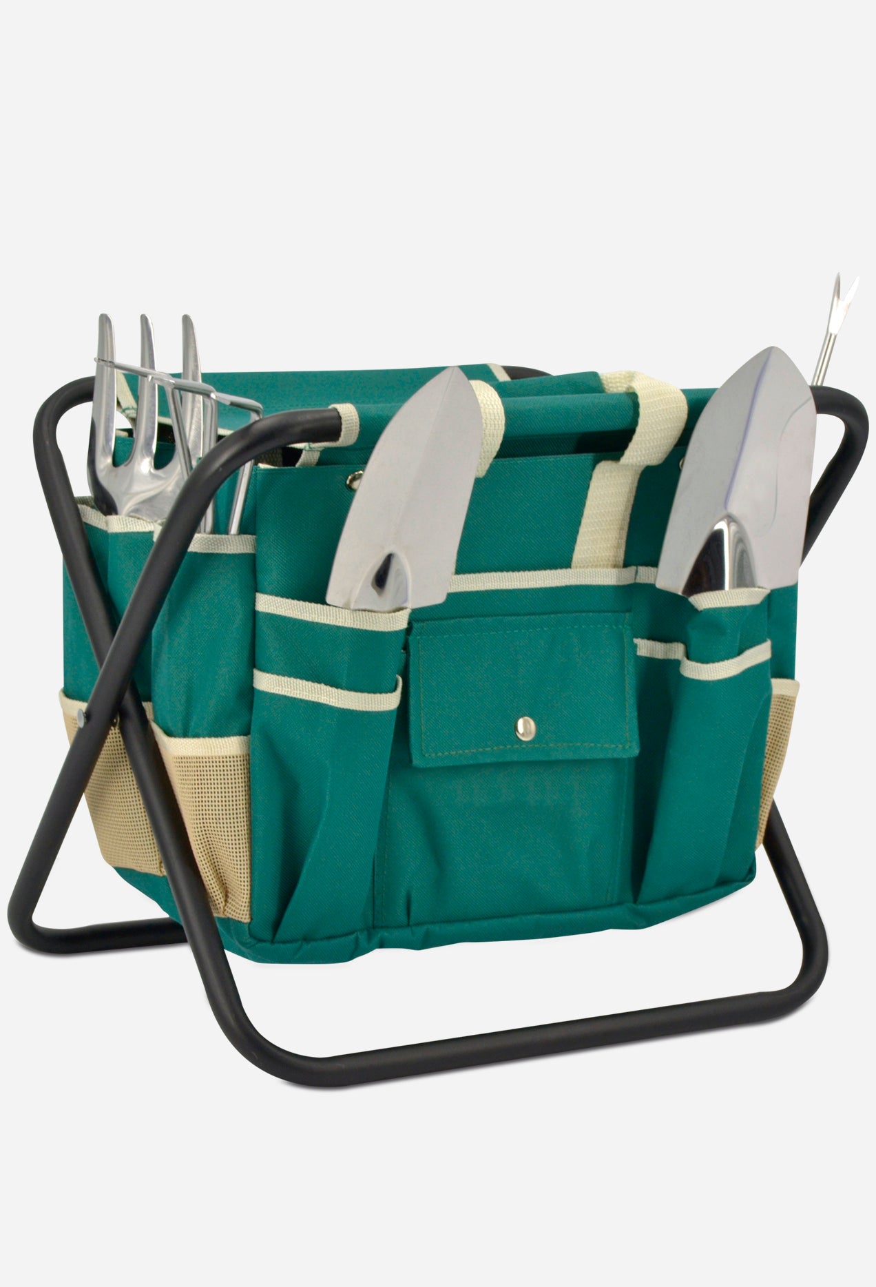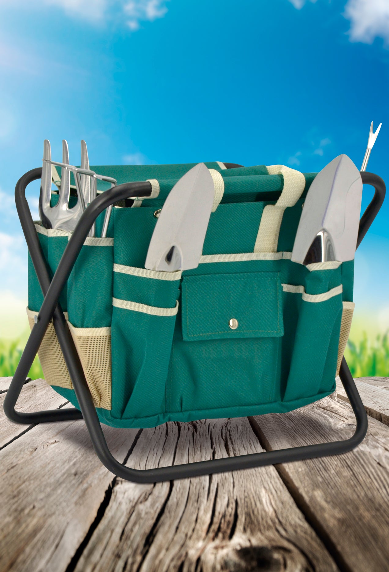 Enjoy your garden with this convenient Gardening Tools Set with detachable bag and folding seat.