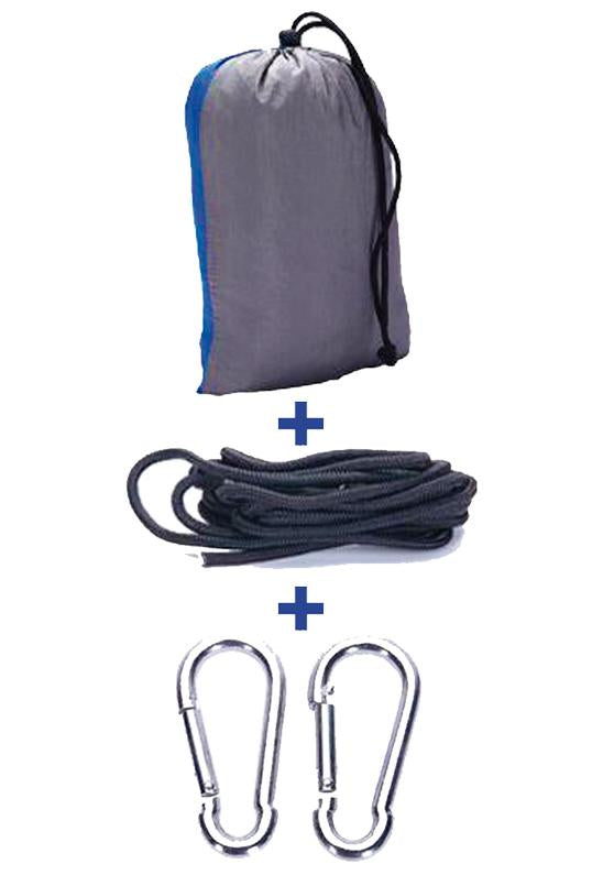 2-Person Portable Hammock Set (6-Piece) Great for camping, hiking, backpacking, picnics, or light travel Lightweight and portable design Material: strong and durable parachute nylon fabric Product dimensions: 8.5’ x 4.5’ Weight limit: 440lb. Comes with an instruction manual
