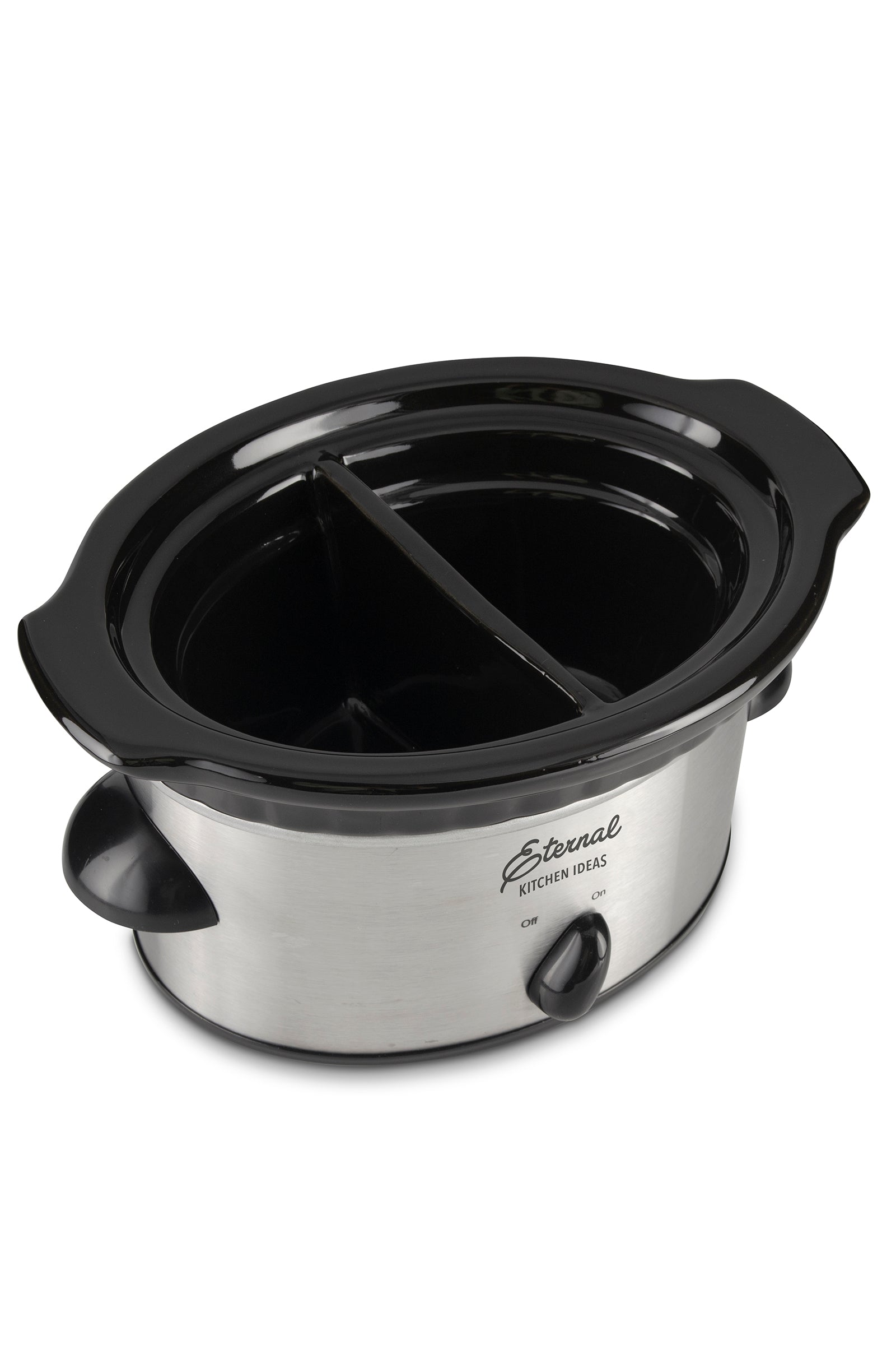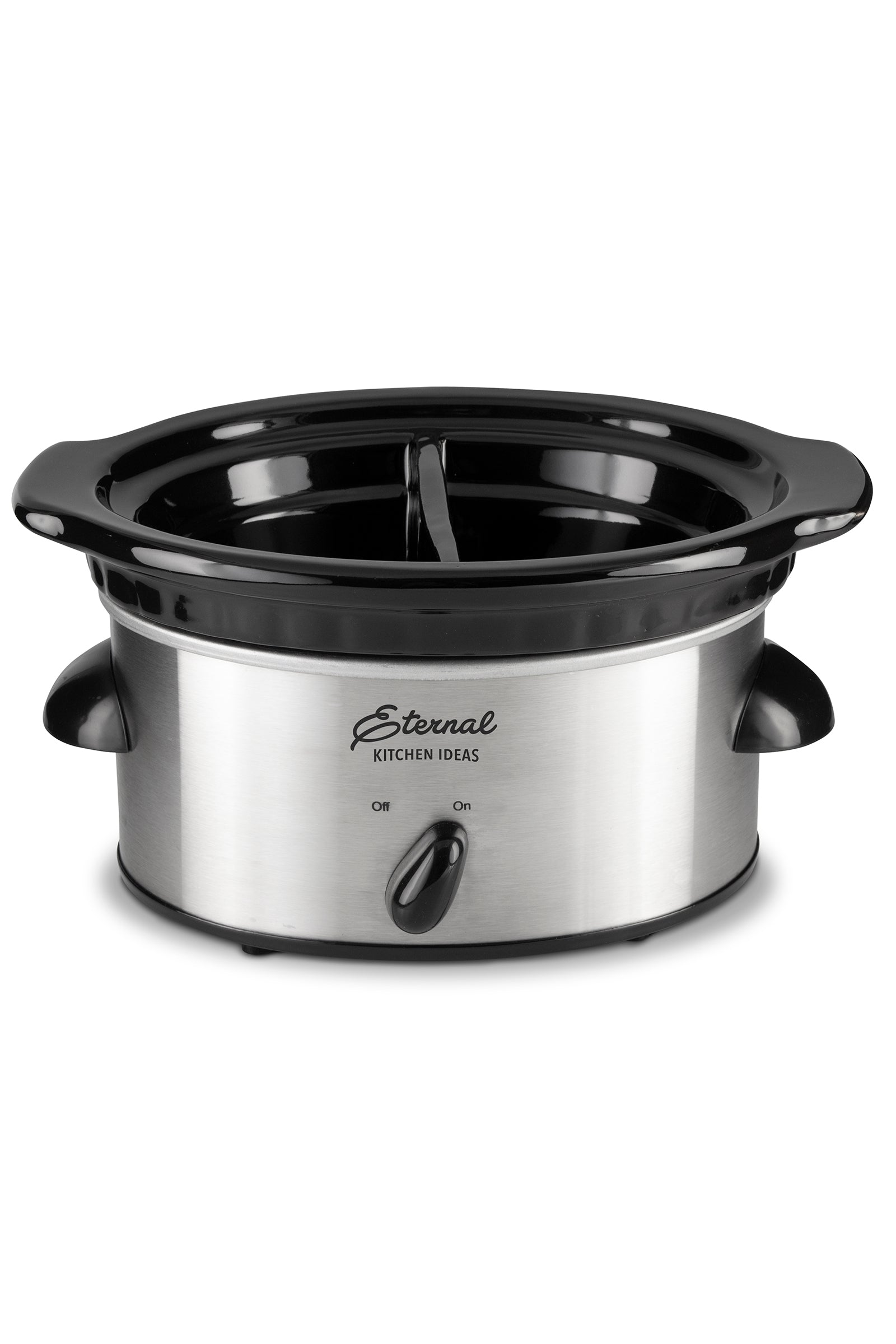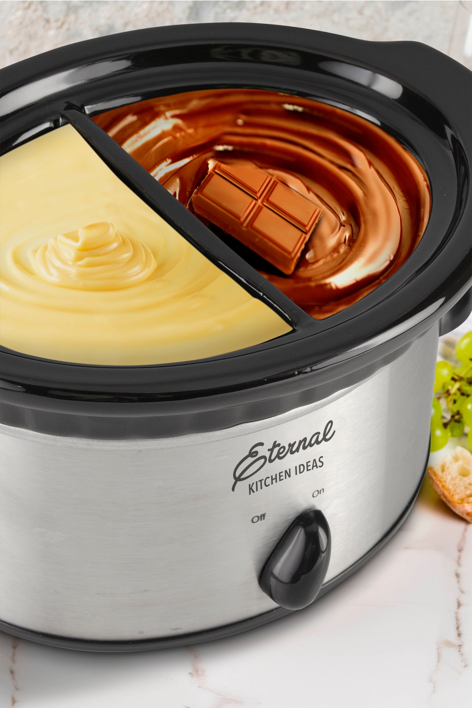 Prepare warm dips for your next party. Chili, cheese, spinach, or artichoke dips, bbq sauce, and much more. Keep 2 dips warm in the same pot without mixing together. Can be used to also melt chocolate and then dip cookies, pretzels, and fruits. Melt some caramel for dipping apple, bananas, the sky's the limit for taste.