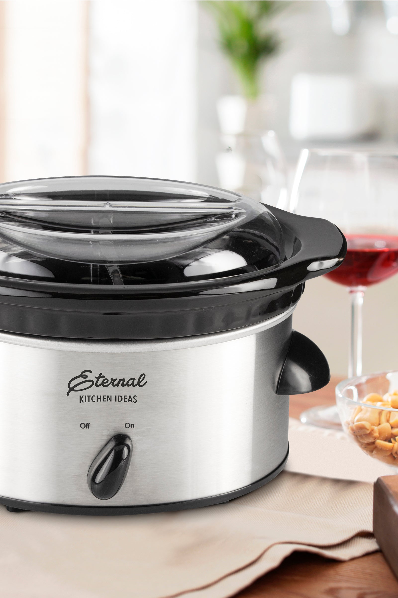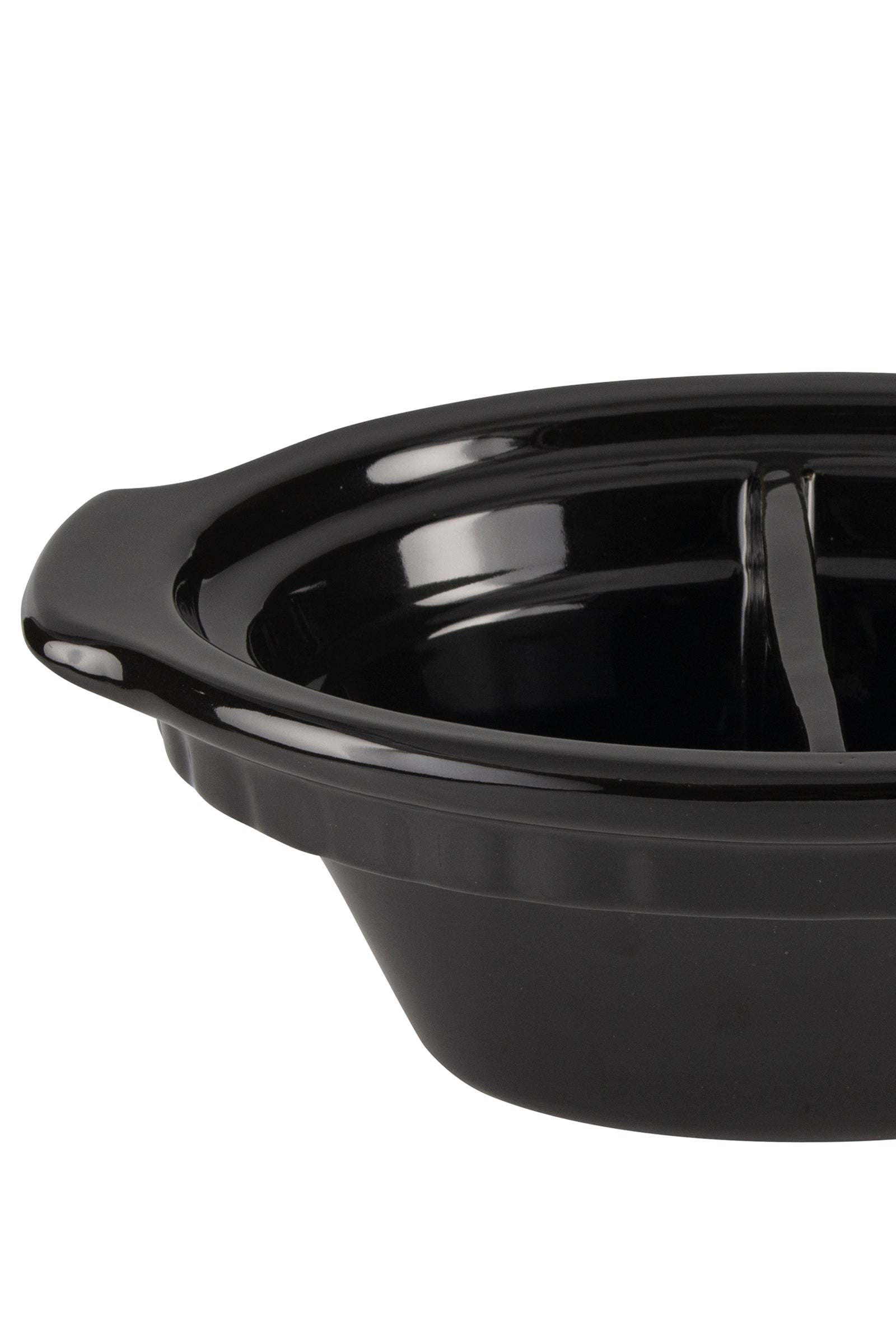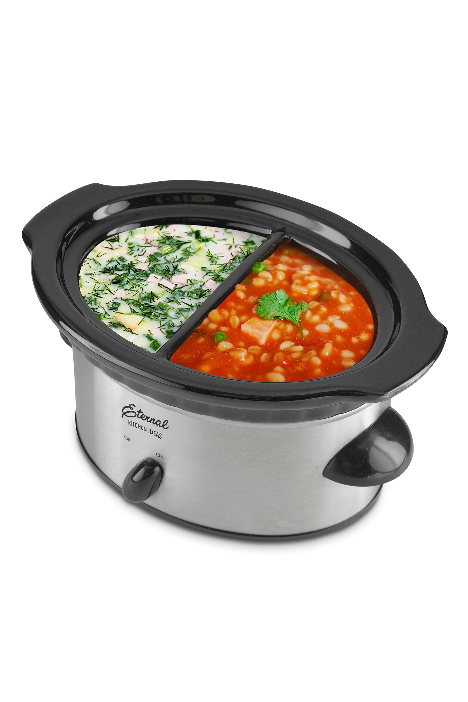 Prepare warm dips for your next party. Chili, cheese, spinach, or artichoke dips, bbq sauce, and much more. Keep 2 dips warm in the same pot without mixing together. Can be used to also melt chocolate and then dip cookies, pretzels, and fruits. Melt some caramel for dipping apple, bananas, the sky's the limit for taste.