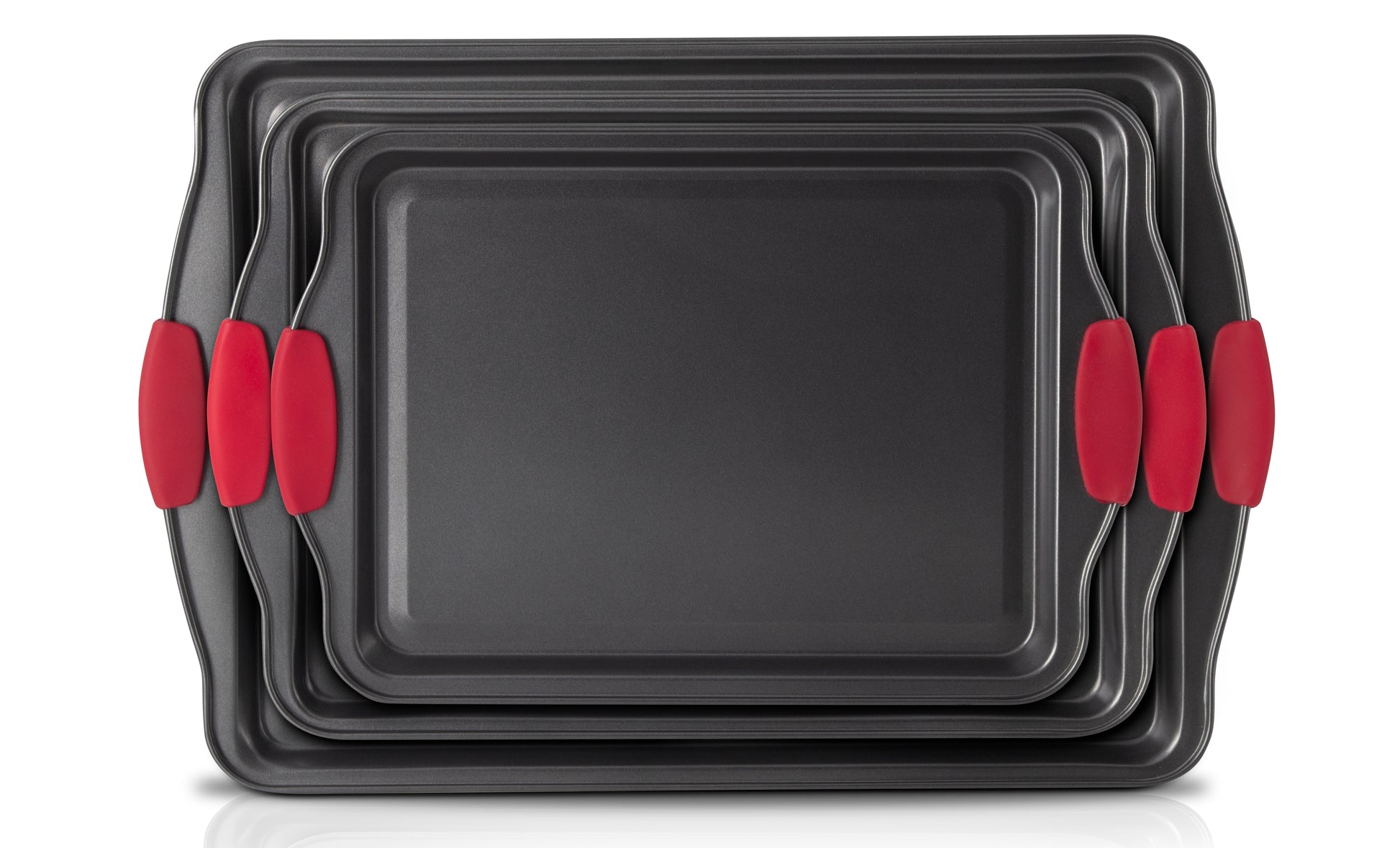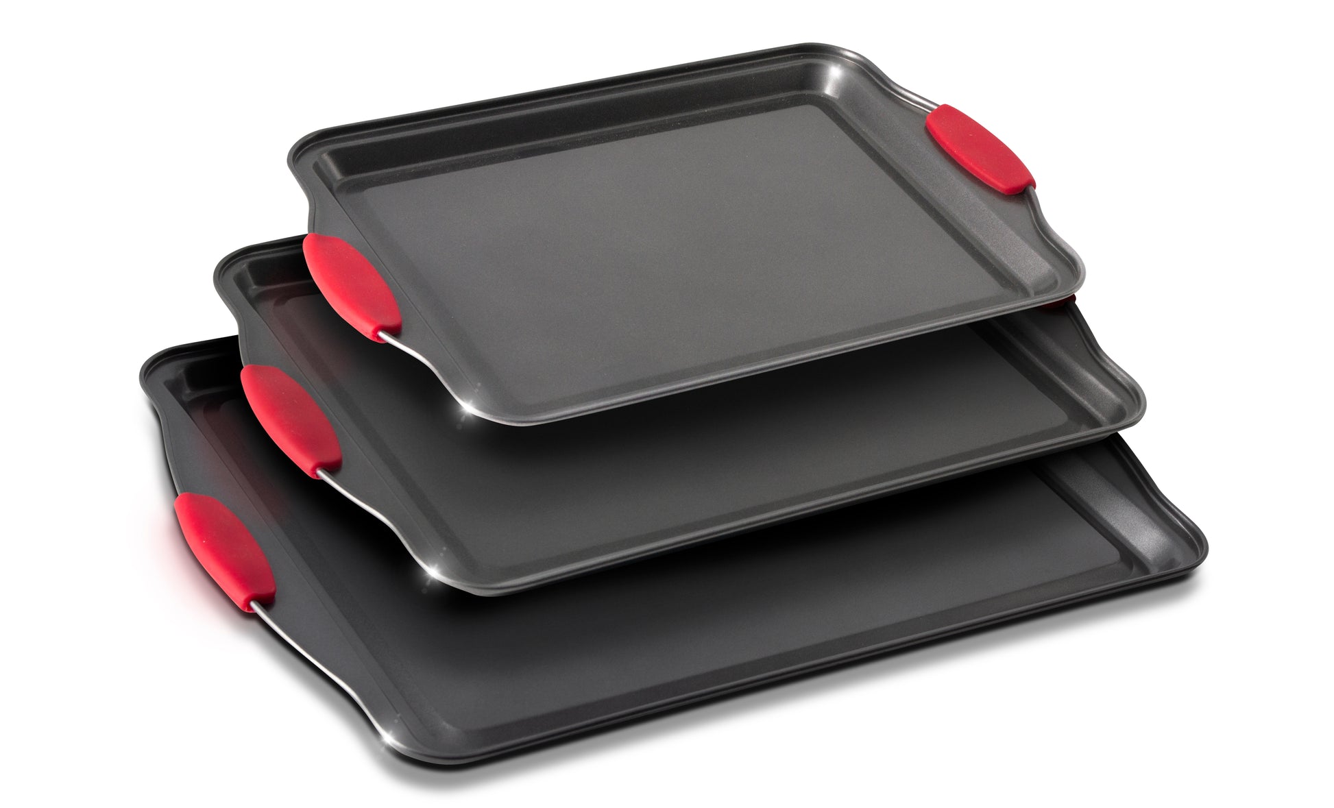Eternal Living Non Stick Baking Pans Cookie Sheets for Baking with Red Silicone Handles 3pc Set Large, Black