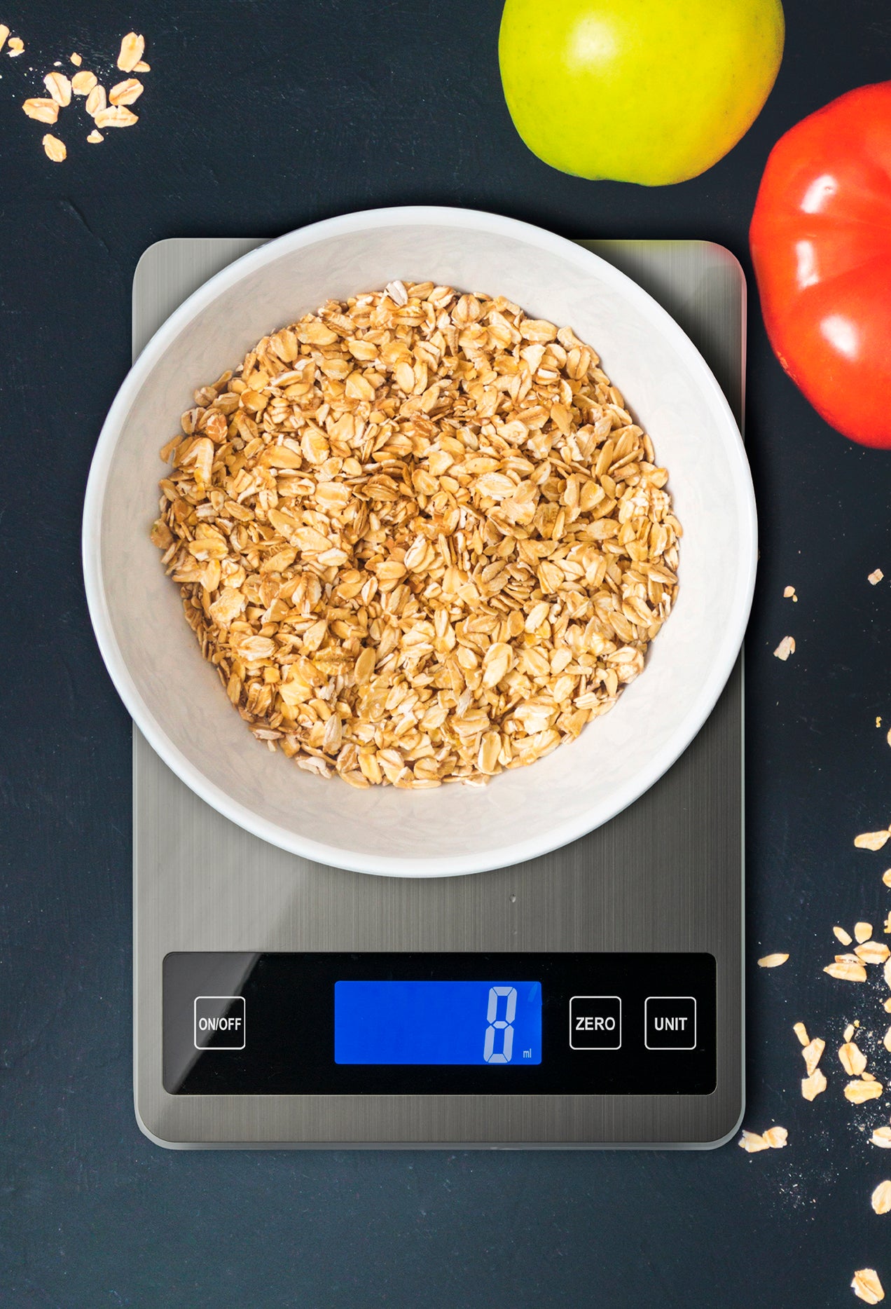 The premium tempered glass panel offers superior durability whilst being waterproof and protected against spills, food residue and water damage, makes wipe cleaning a breeze, easy to keep clean. Sensitive touch buttons bring a quick and friendly user experience that is vital during cooking, baking or meal prep. Perfect size and easy to store enough platform for weighing various ingredients and won’t take much space in your countertop. Tare function, weigh liquids and messy ingredients accurately easily with tare function. Place a container on the scale and press zero once to subtract its weight. Portion control is a large aspect of a healthy diet, and food scales can certainly help with that. Weigh your chicken breast, then your broccoli, then your cluster of blueberries to determine if they’re weighing in at the suggested healthy amount. Or weigh your entire meal together! Placing your snacks and sweet treats on a kitchen scale is the quickest and most simple way to determine if you’re eating the correct portion size each meal. For example, if a healthy serving of chicken is 3-4 ounces, you’ll be able to place your chicken on the scale to ensure it is consistent with this weight. Yes, food scales can help you lose weight! Regulating portion and serving sizes is just the beginning. Weighing your food is a healthy habit because it holds you accountable for what (and how much!) you’re putting in your body. If you’re looking to lose weight, using a food scale assists you in keeping up with your diet and healthy regimes.