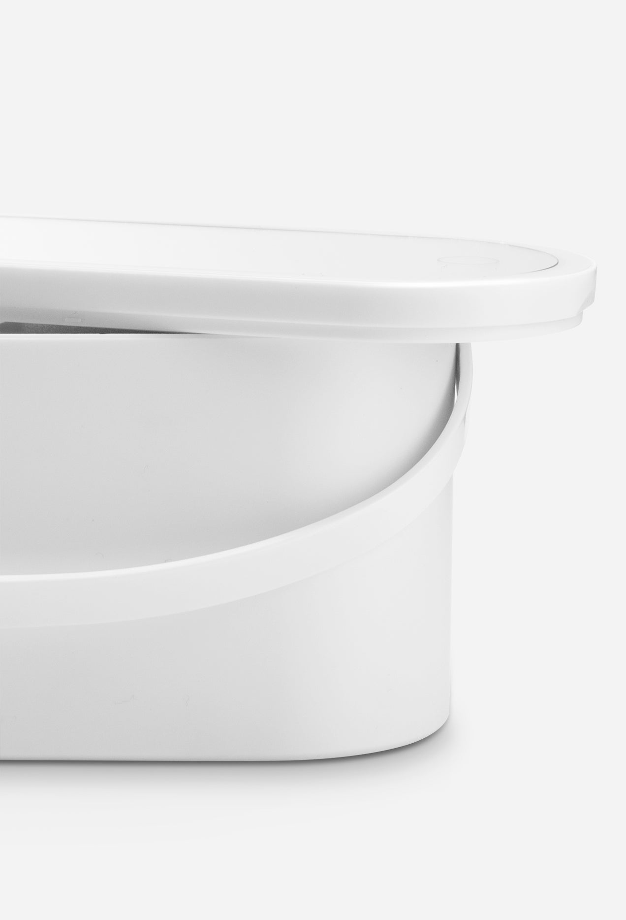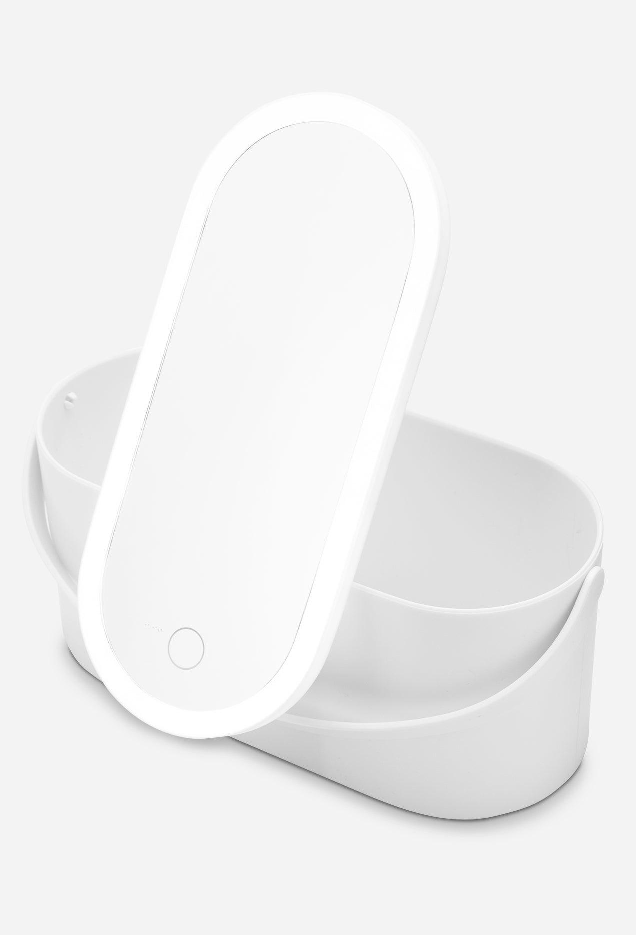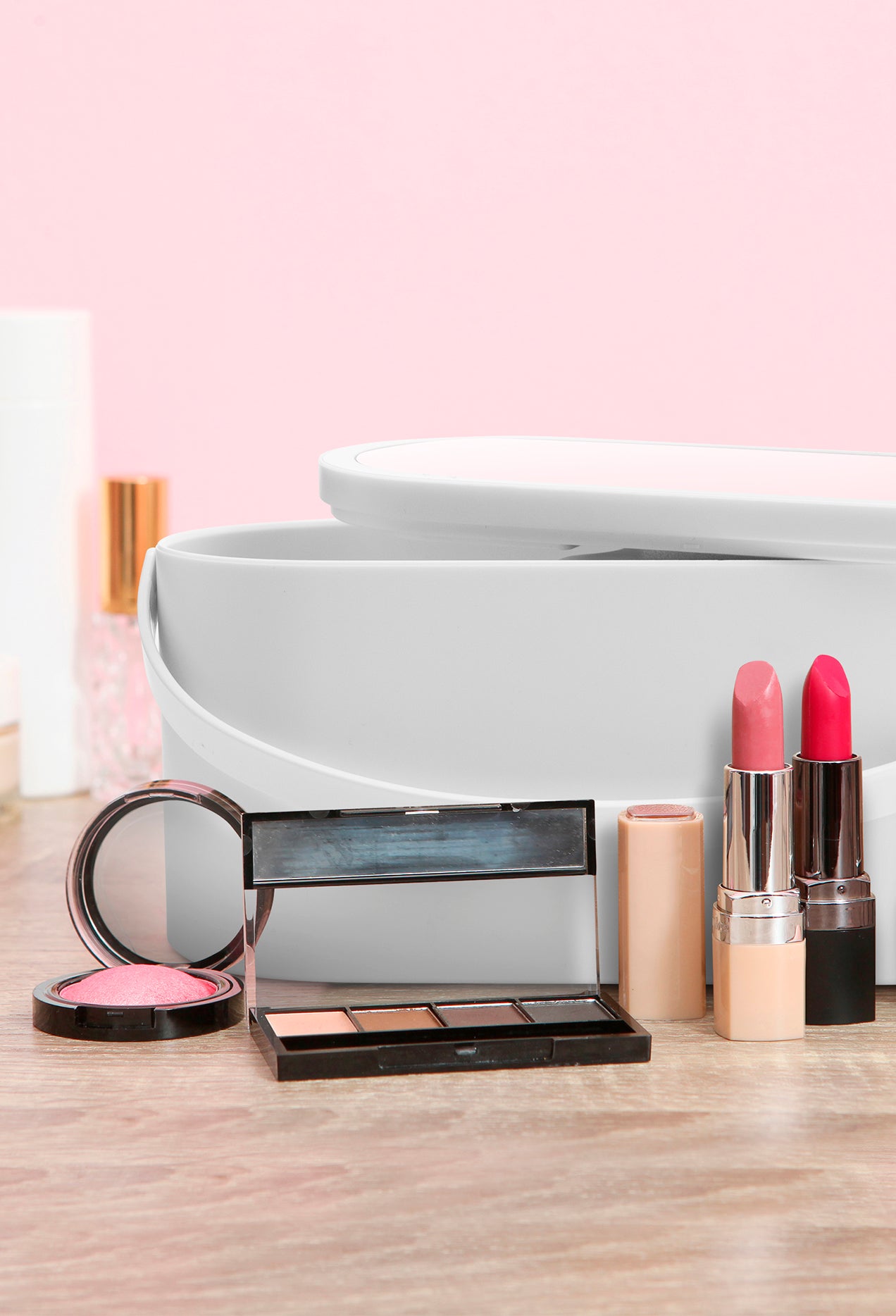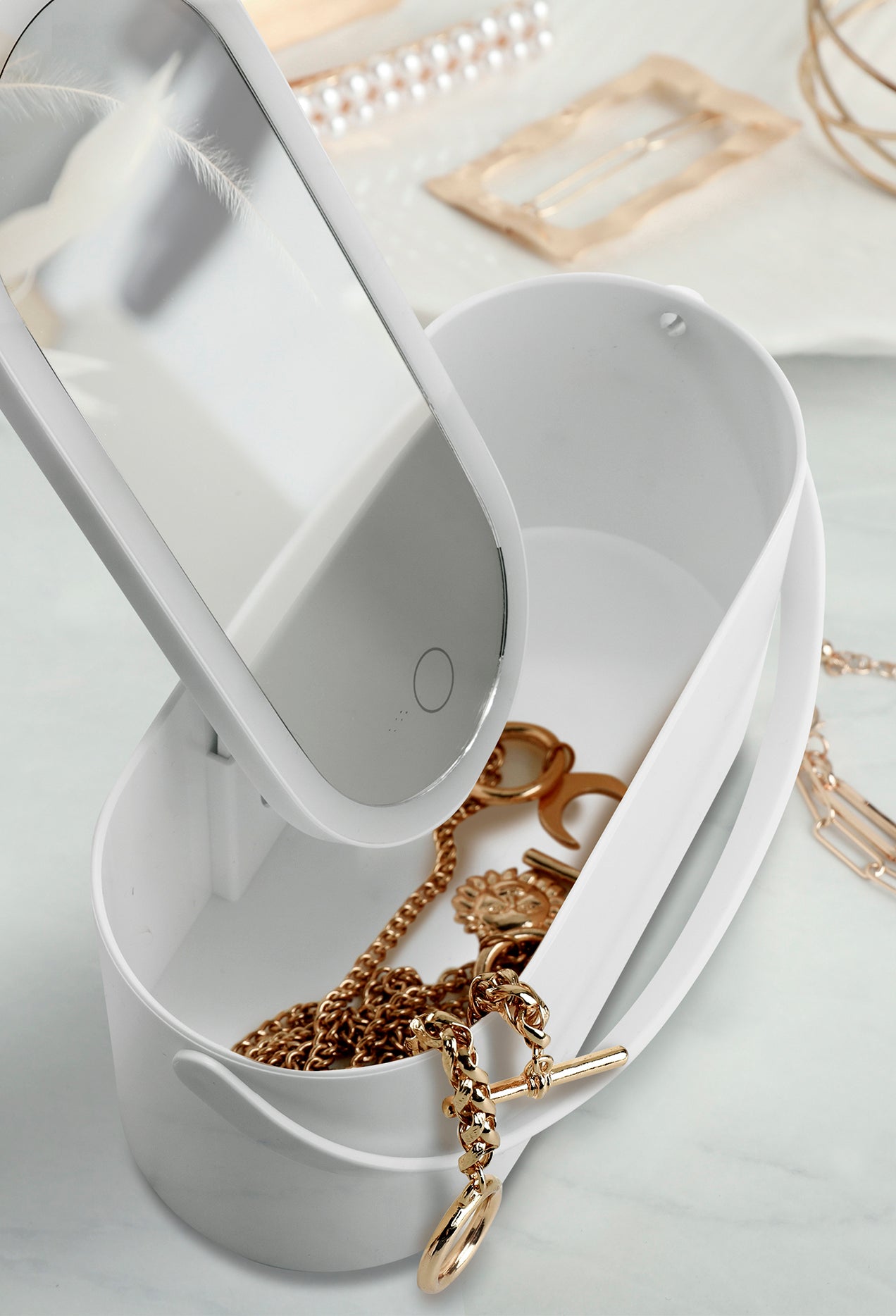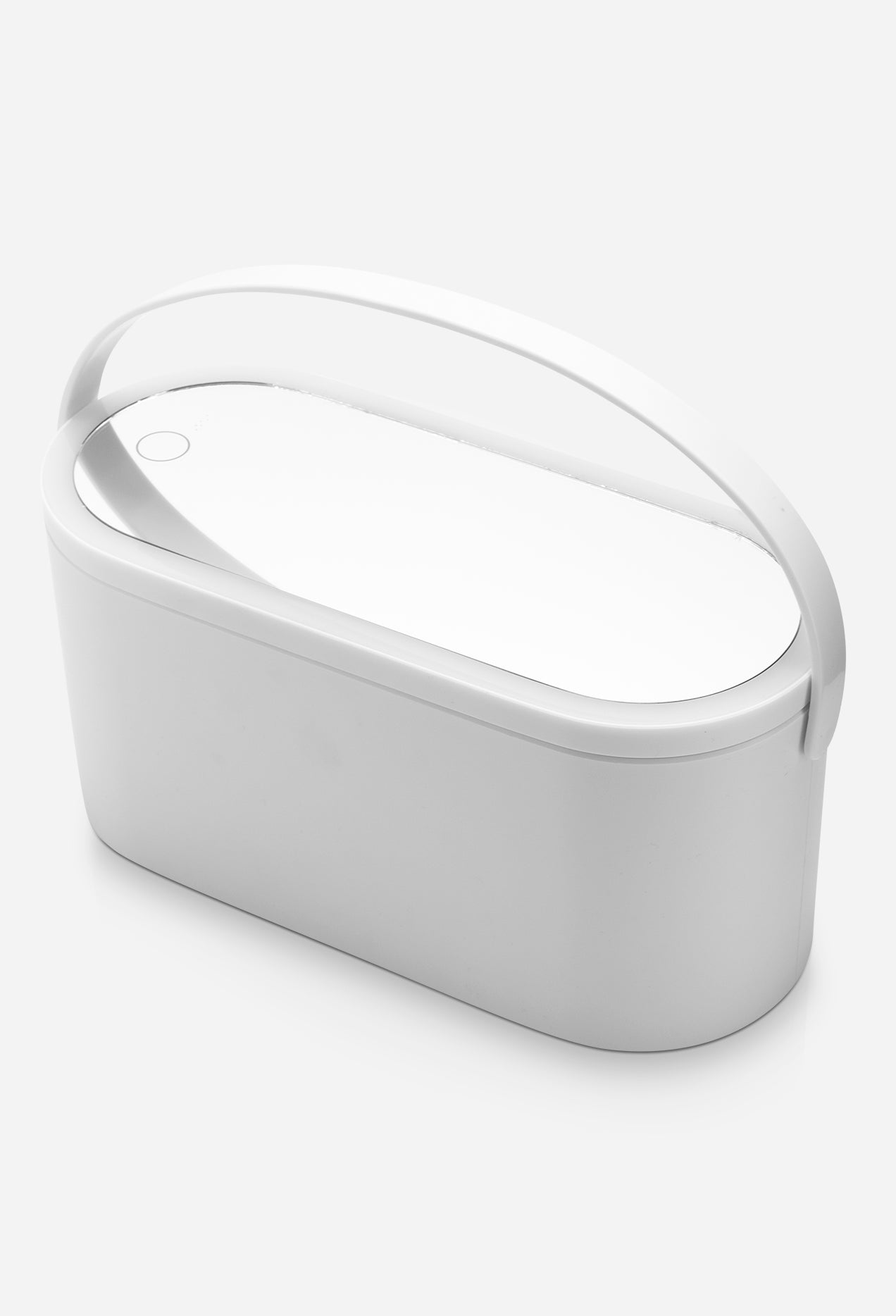 This cosmetic makeup organizer box is perfect for those with limited counter vanity and table space. Organize your makeup, skin care products, and even jewelry in the main storage compartment. The lid comes equipped with a bright 5200k White LED light that comes on with the easy one touch button. This light is fully dimmable with a long press. The LED mirror is fully rechargeable with the included USB cord, making it the perfect energy saver. Need to travel? The carrying handle is perfect to transport all of your items on the go.