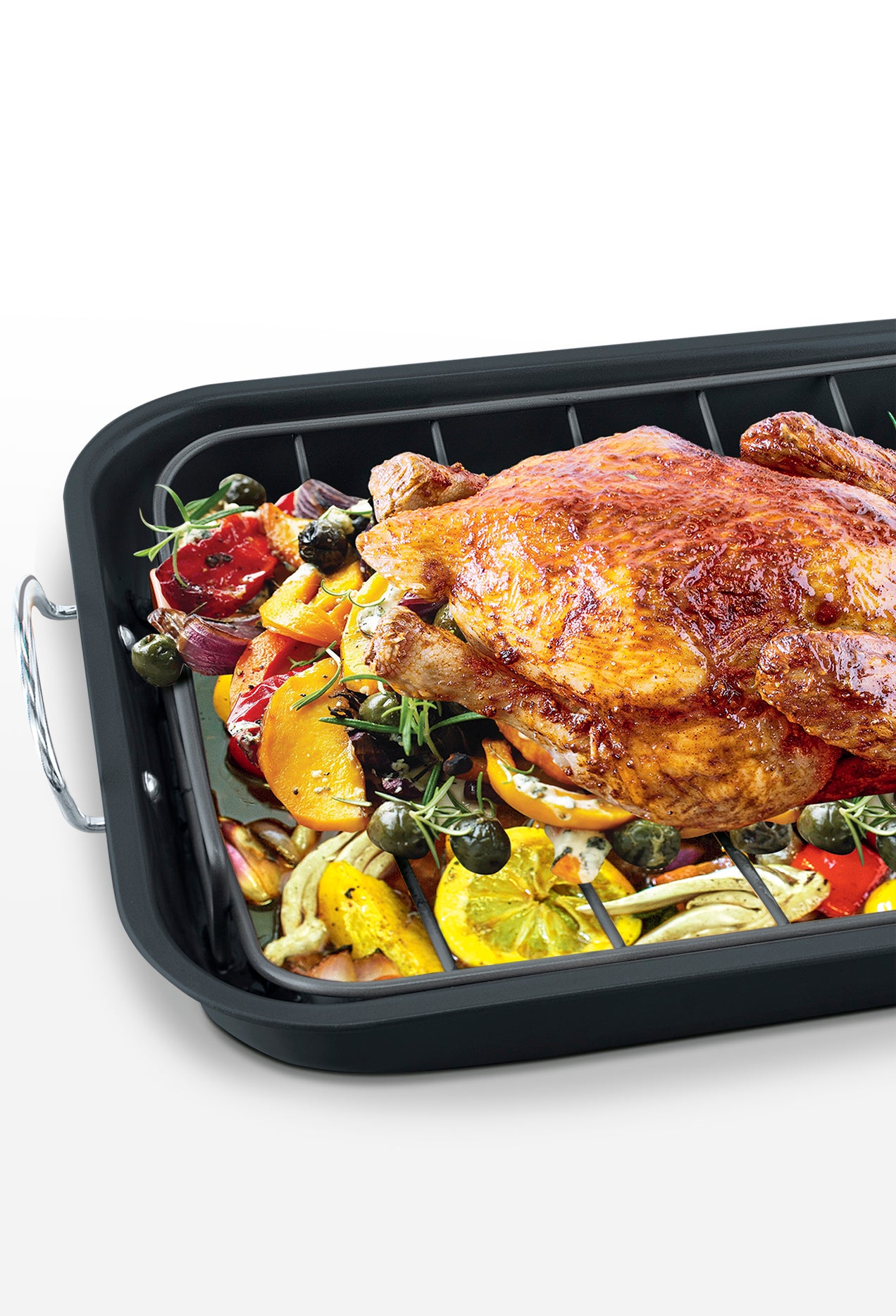 Elevated cooking experience: roasting pan features a removable chrome-plated rack which raises meats up to allow fats to drip away