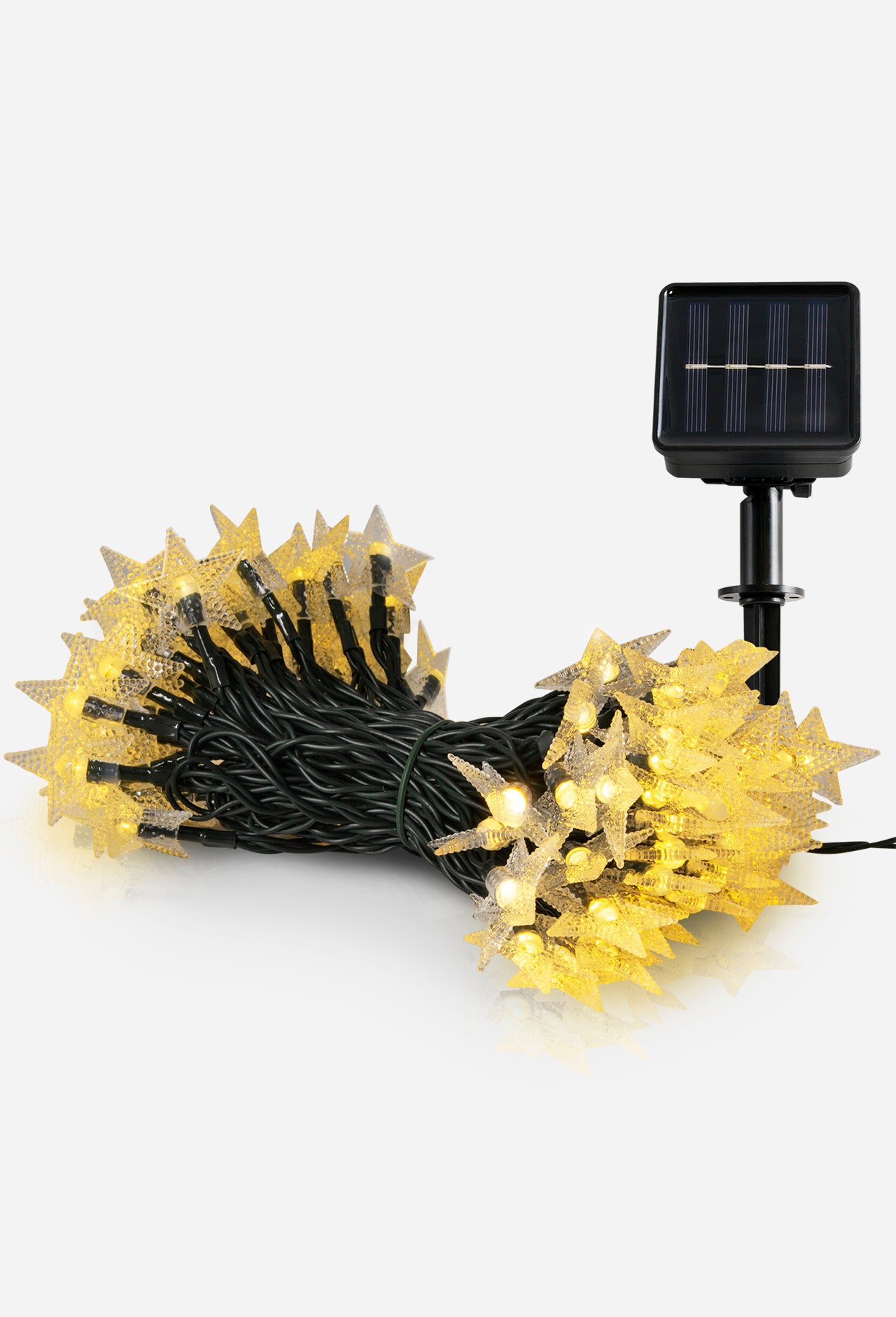 Decorate your backyard, patio, or garden with this set of 100 Solar Powered Star String Lights. Each star bulb emits a soft warm light. They can be used indoors or outdoors (indoor use still requires solar charge). Automatically charges during the day and turns on when dark (or when solar panel is covered). Energy efficient: no outlet needed and no need to replace batteries. Weather-proof and perfect for year-round use. Star shaped bulbs make the perfect Fairy Lights and create a romantic aura. The dark green wire helps to easily blend in with trees, and shrubs.