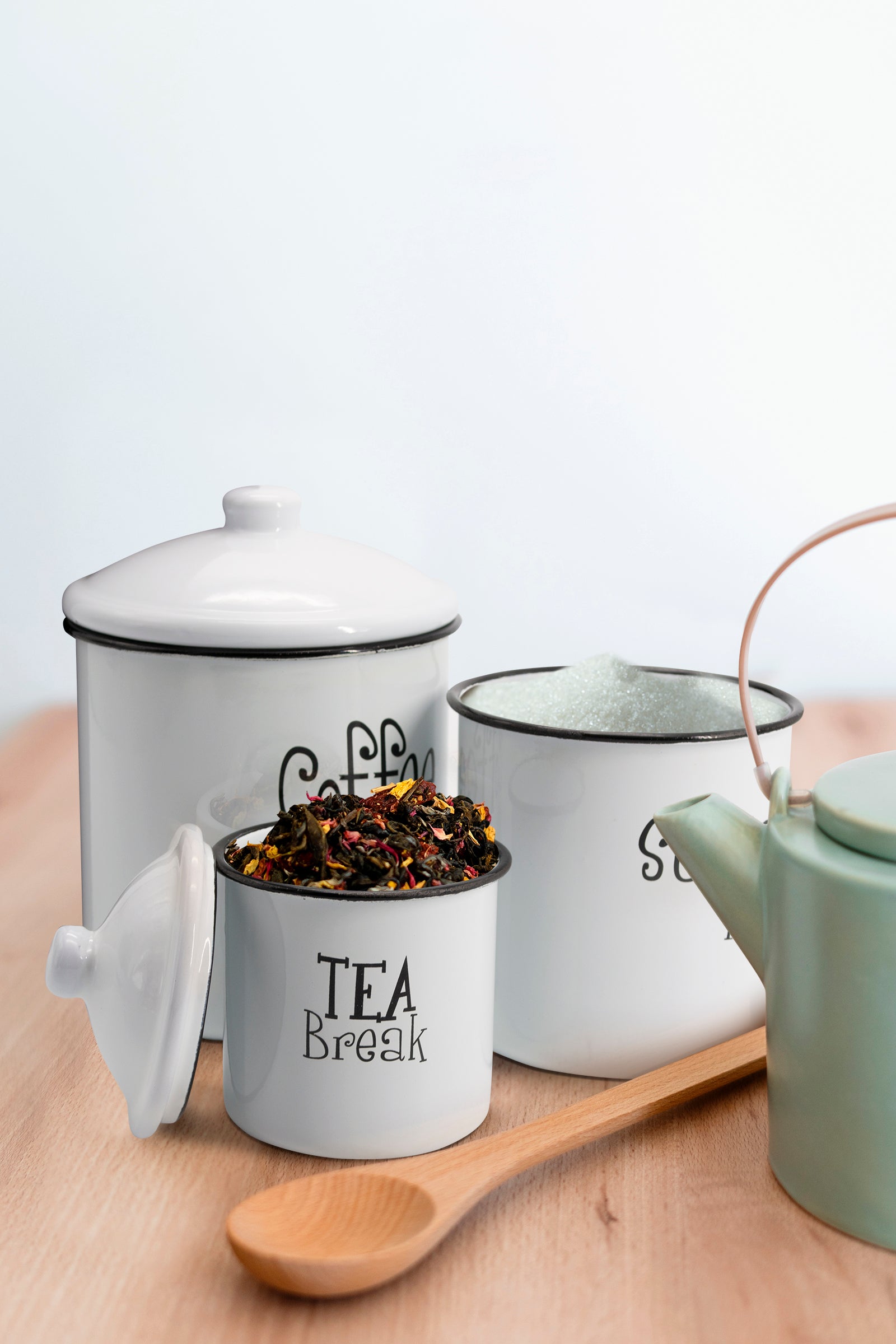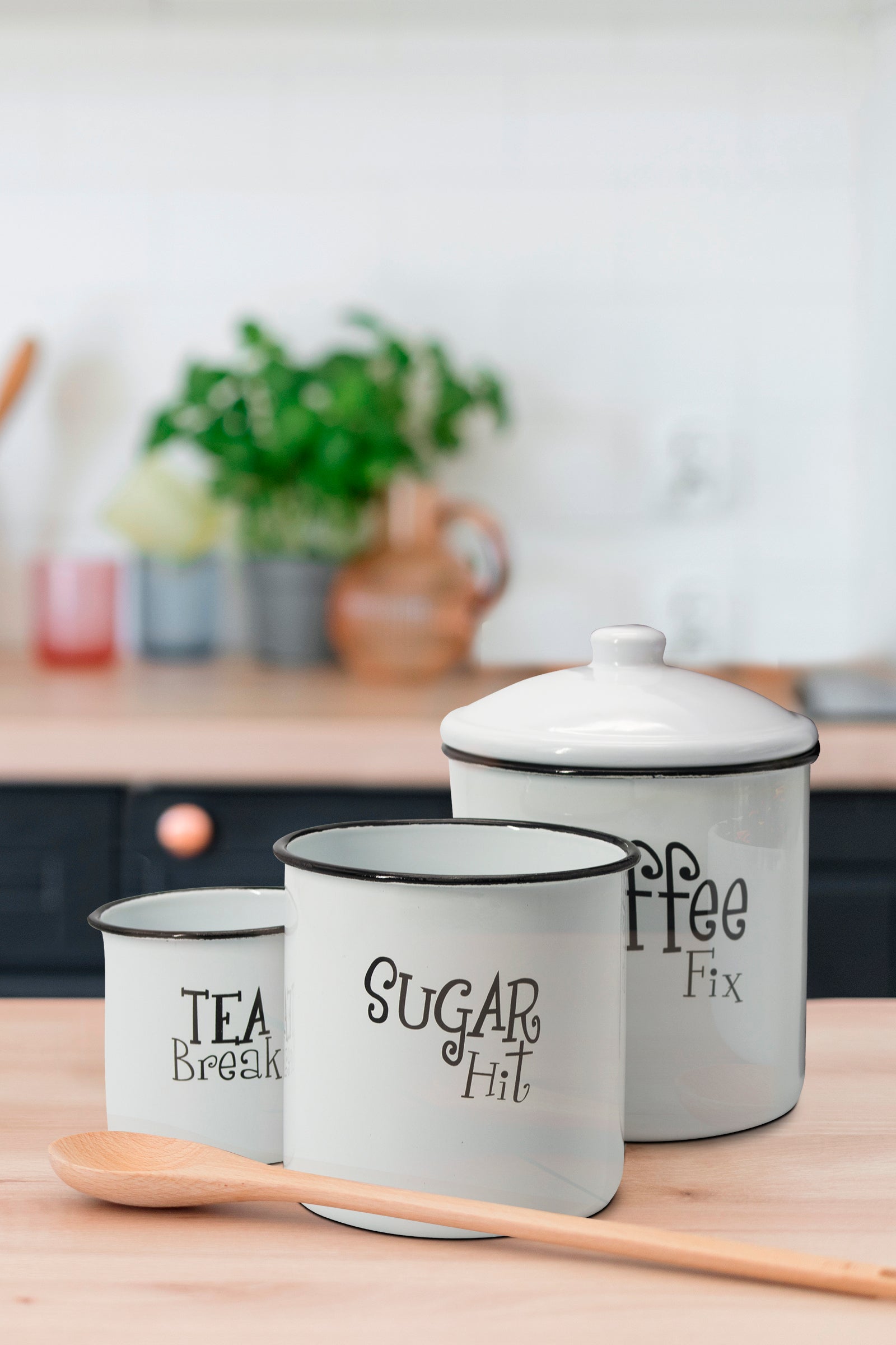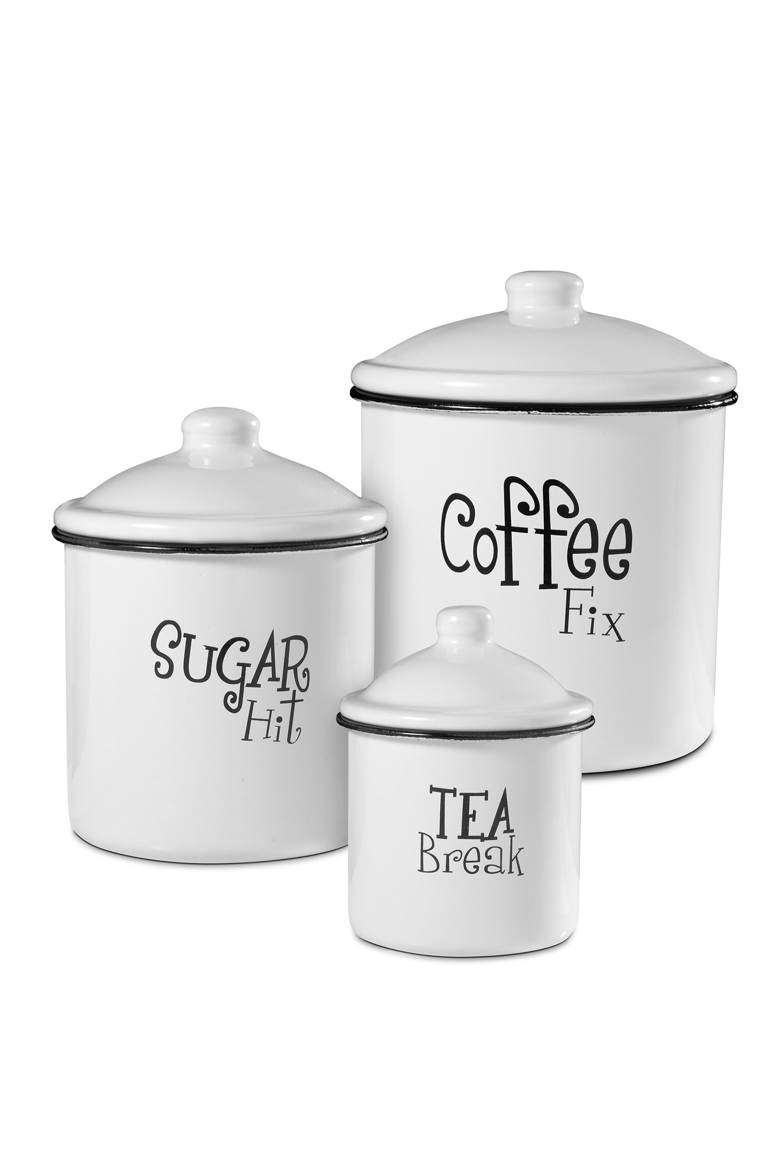White Enameled finish with a black trim on the rim for a vintage inspired look. Useful and beautiful countertop décor. These canisters are not only for tea, sugar, and coffee but can also be used for keeping cookies, salt, spices, and other fresh ingredients. The perfect housewarming gift idea. Durable Metal construction, with a white enamel finish. Each canister comes with a lid to protect your food from bacteria and pests. Whimsical lettering with Coffee, Sugar, and Tea labels. Three sizes to choose from.
